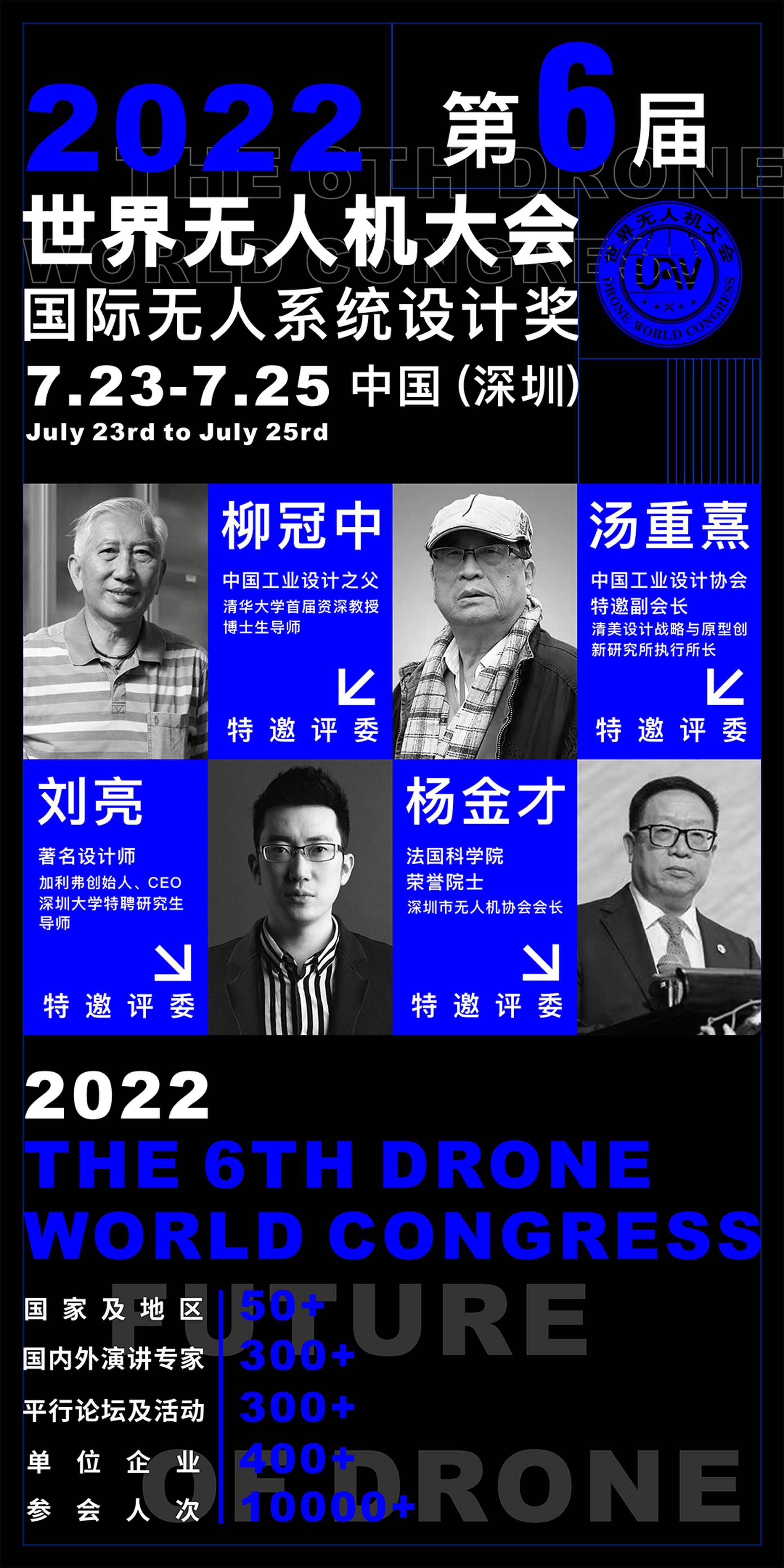 本次大会特设国际无人系统设计奖,大会邀请欧洲科学院院士、世界无人机大会执行主席杨金才,清华大学首届资深教授、博士生导师柳冠中,中国工业设计协会特邀副会长 、清美设计战略与原型创新研究所执行所长汤重熹,加利弗设计创始人、CEO,世界著名设计师刘亮担任特邀评委。