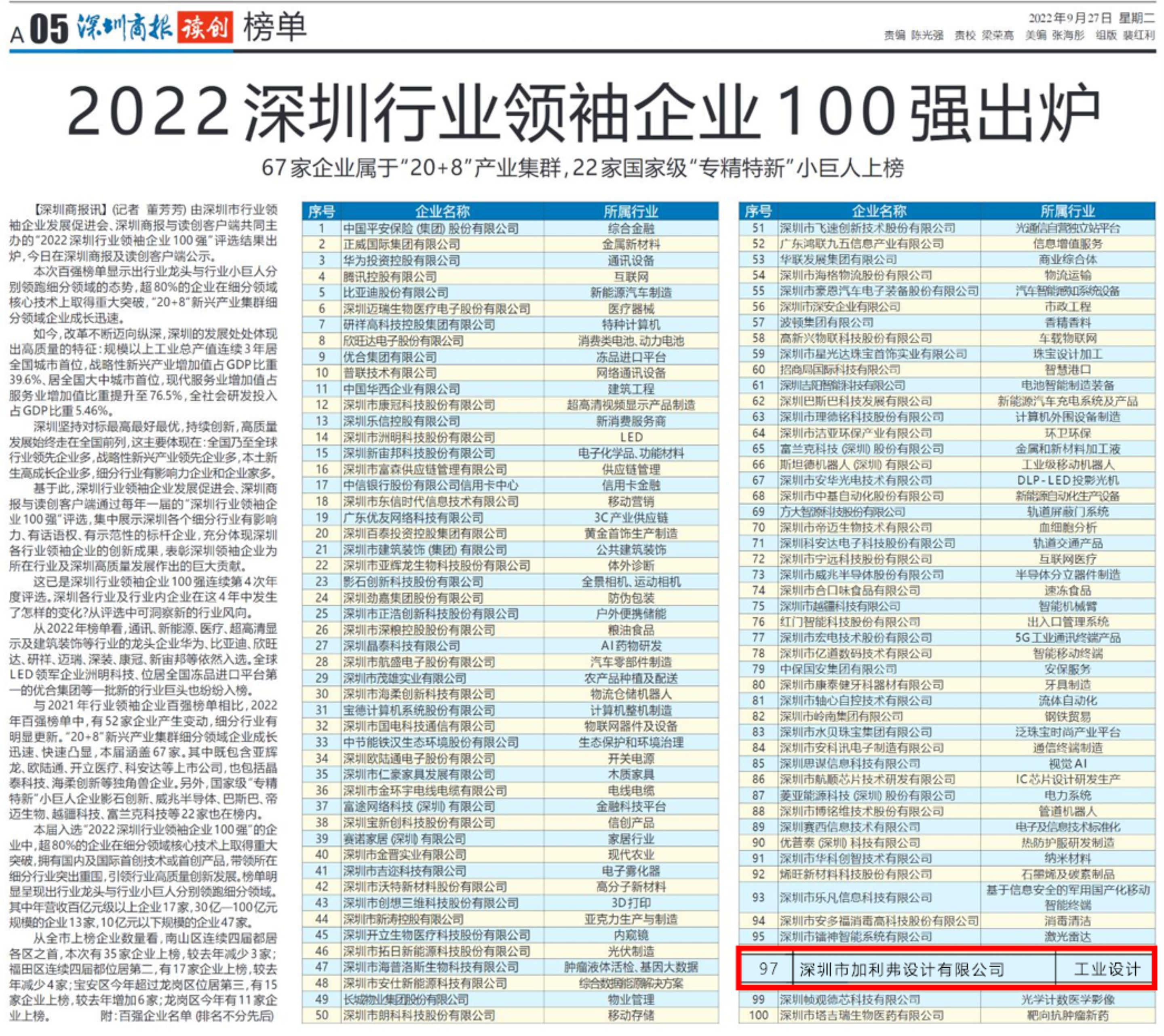 9月27日 ,由深圳市行业领袖企业发展促进会、深圳商报与读创客户端联合发布的“2022深圳行业领袖企业100强榜单”出炉,加利弗作为工业设计行业里的佼佼者再度成功入选!一起上榜的还有华为,腾讯,平安等世界知名企业,加利弗也是深圳近28000家设计公司里在2021、2022年唯一入选并蝉联的设计公司。