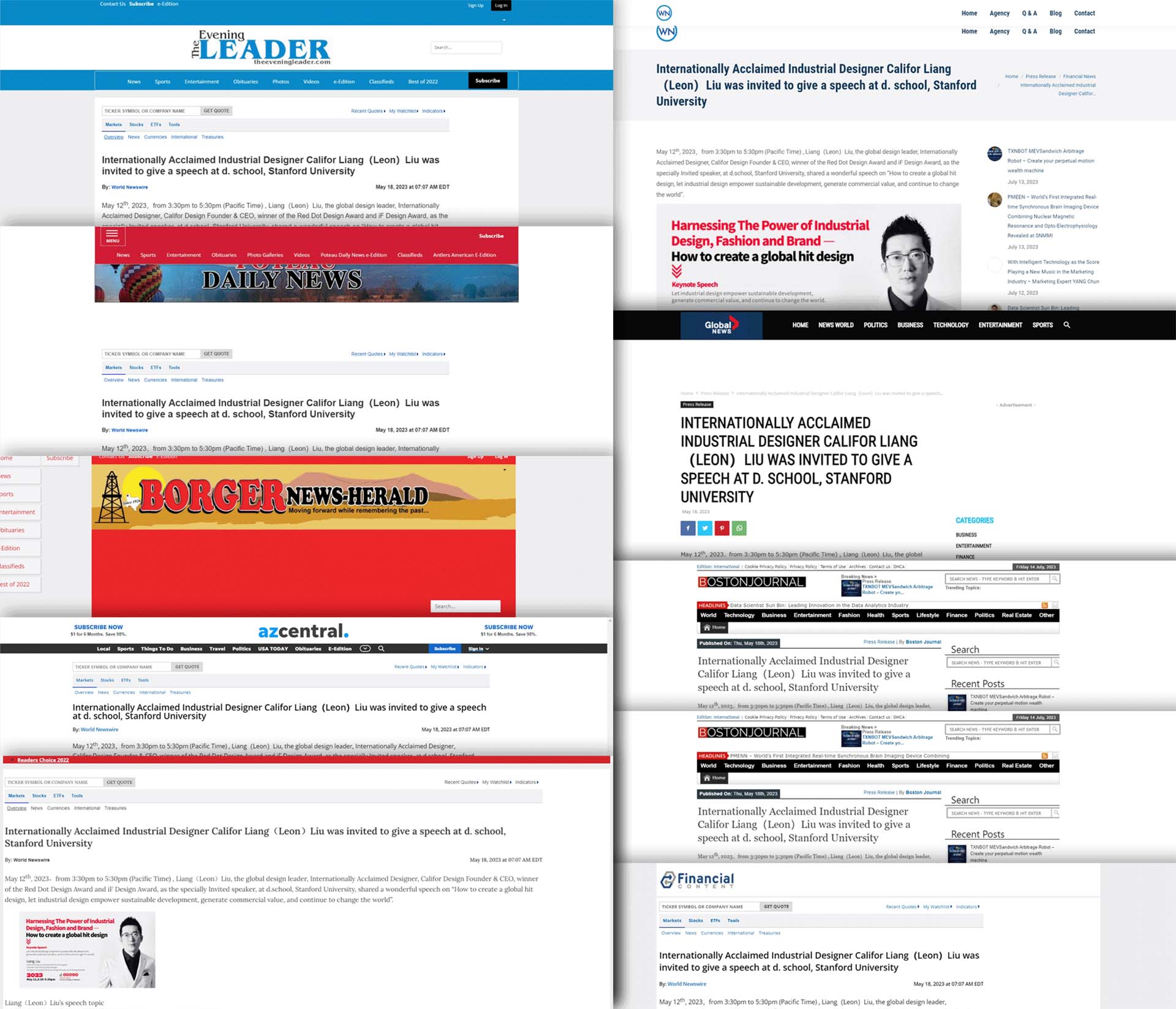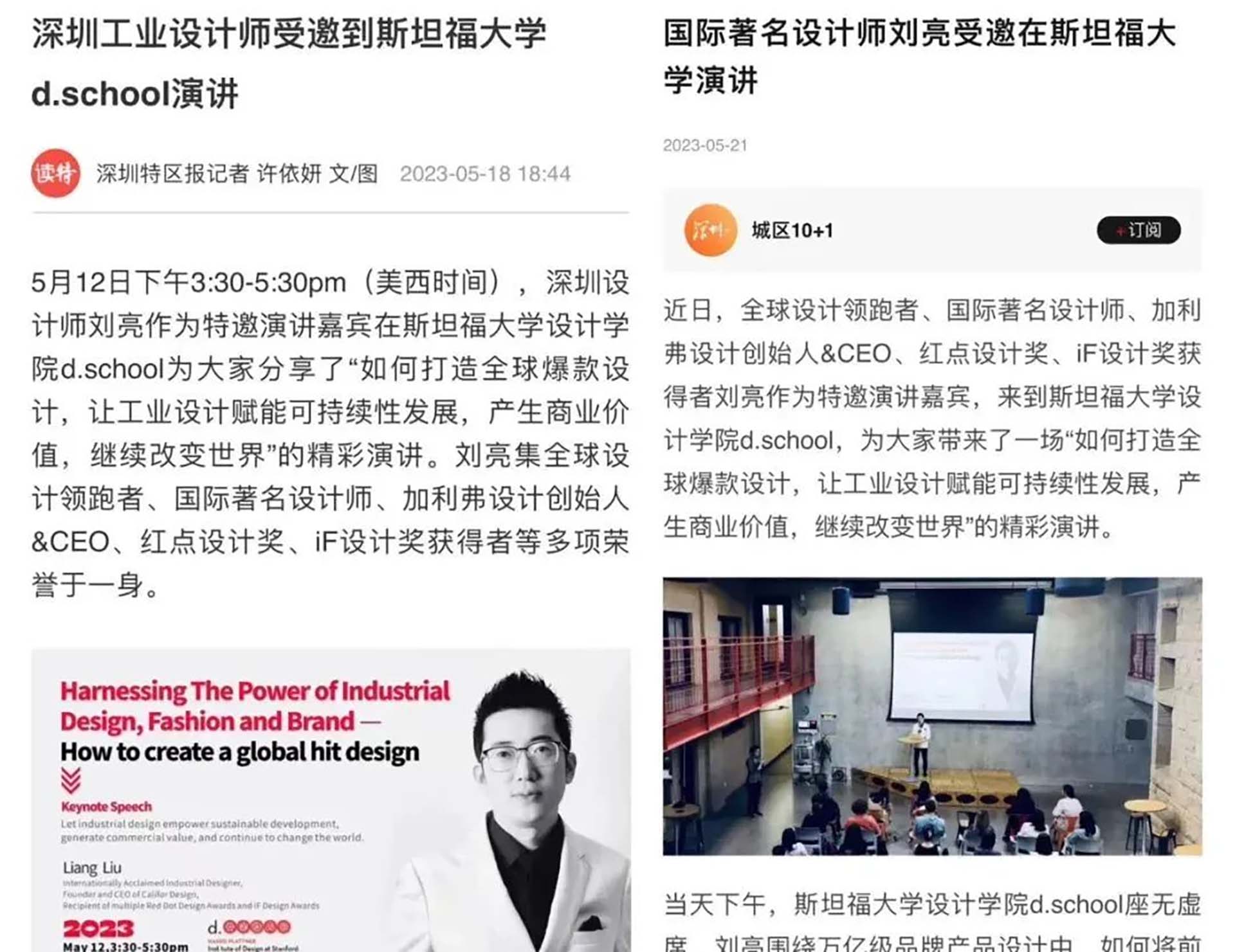 2023全球国际四百多家媒体报道,加利弗创始人、CEO刘亮受邀在斯坦福大学d.school演讲。