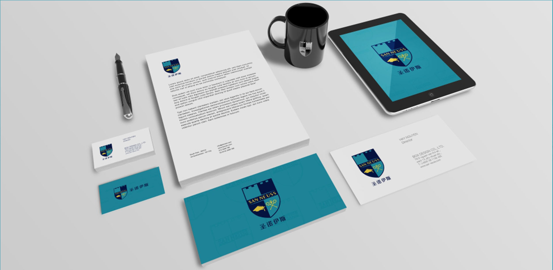 圣.诺伊斯。标识设计整体视觉感采用盾牌元素,图文结合形式,盾牌象征着贵族、神圣的寓意.盾牌内部。加入了“城墙”“学士帽”“权杖”和“百合花”的元素。城墙和学士帽为学校元素,权权杖象征贵族,权利与威严,体现学校的神圣地位。中世纪百合花代表圣洁、纯洁与友谊,体现学校的纯洁环境。