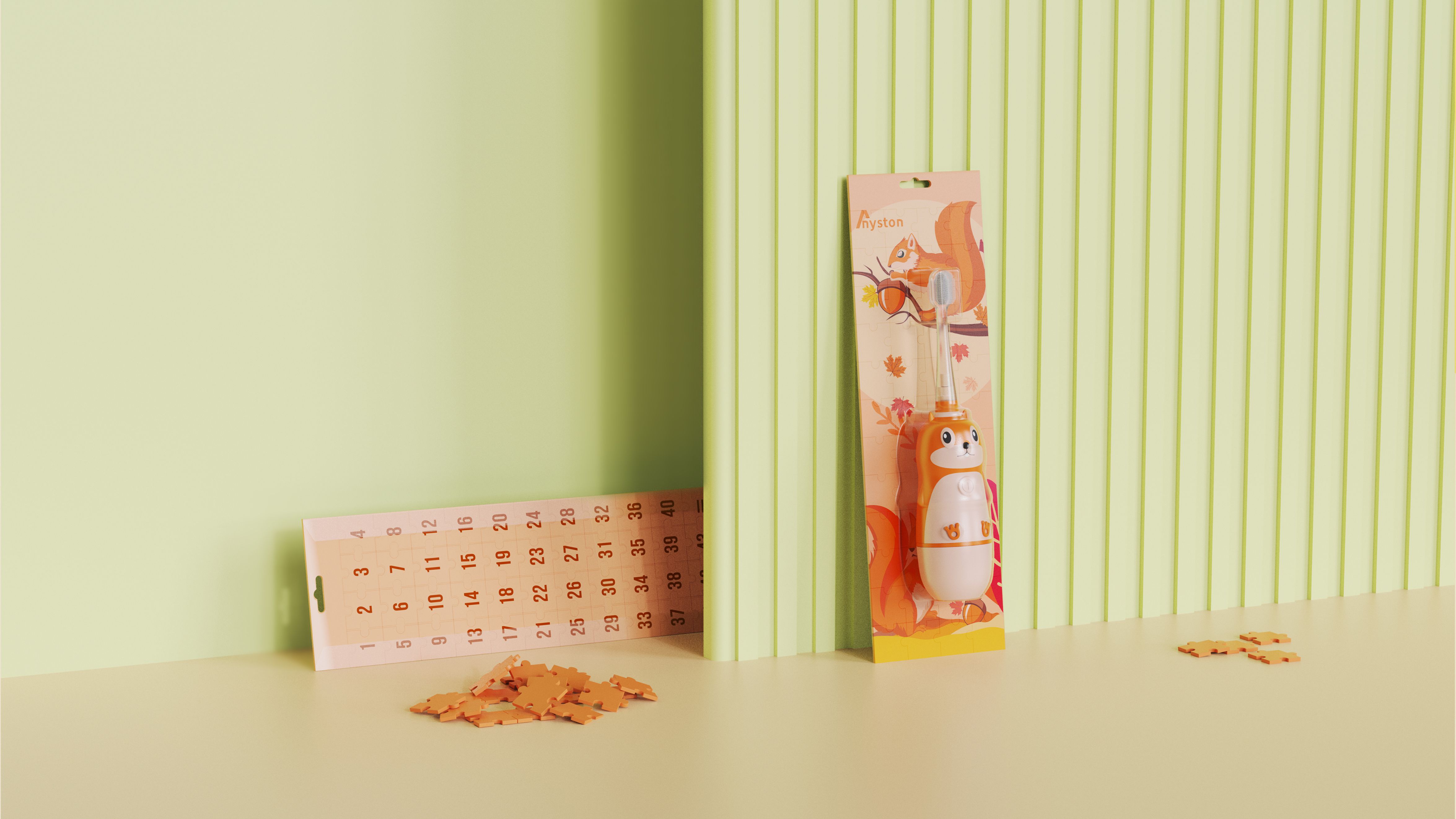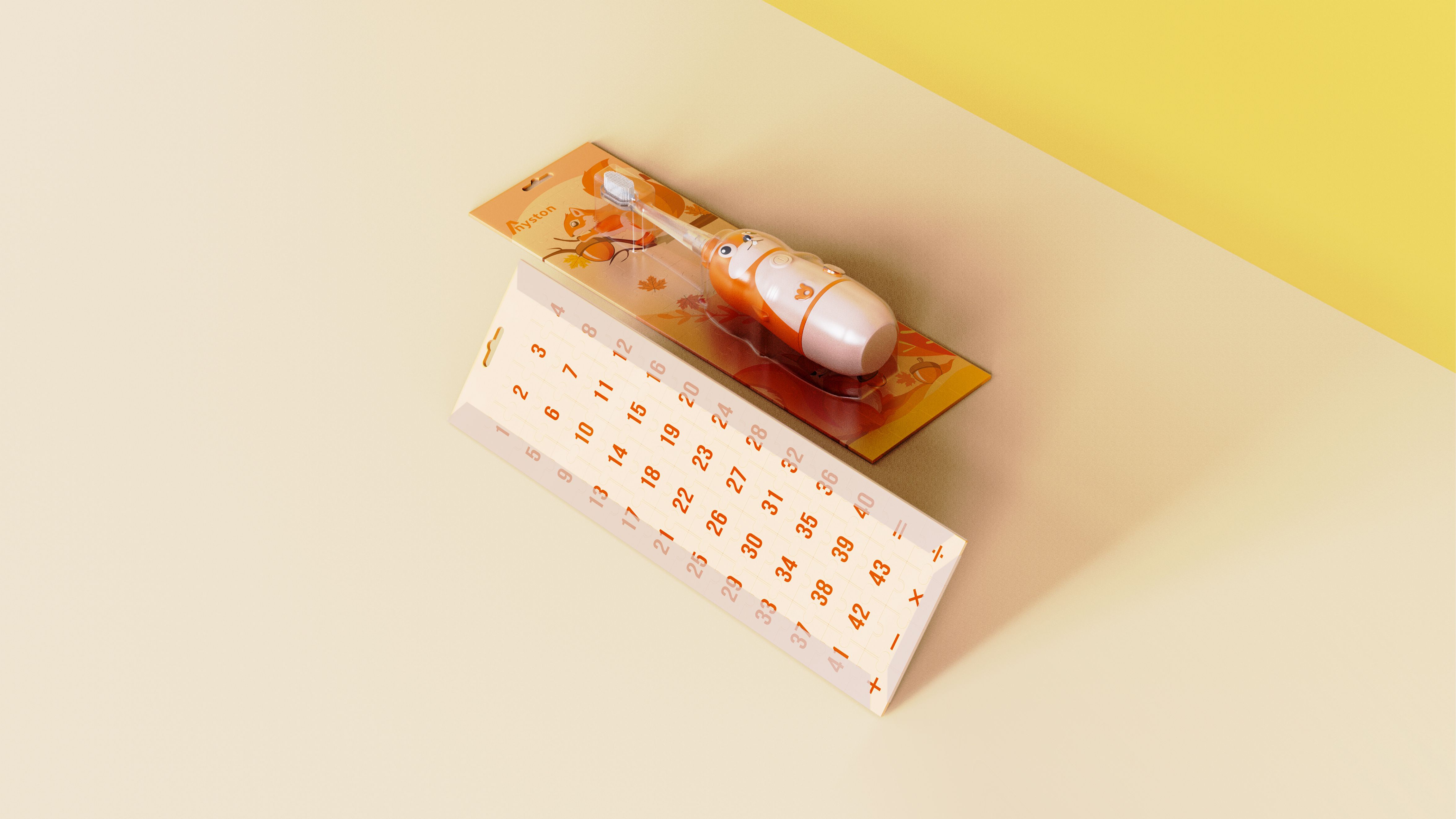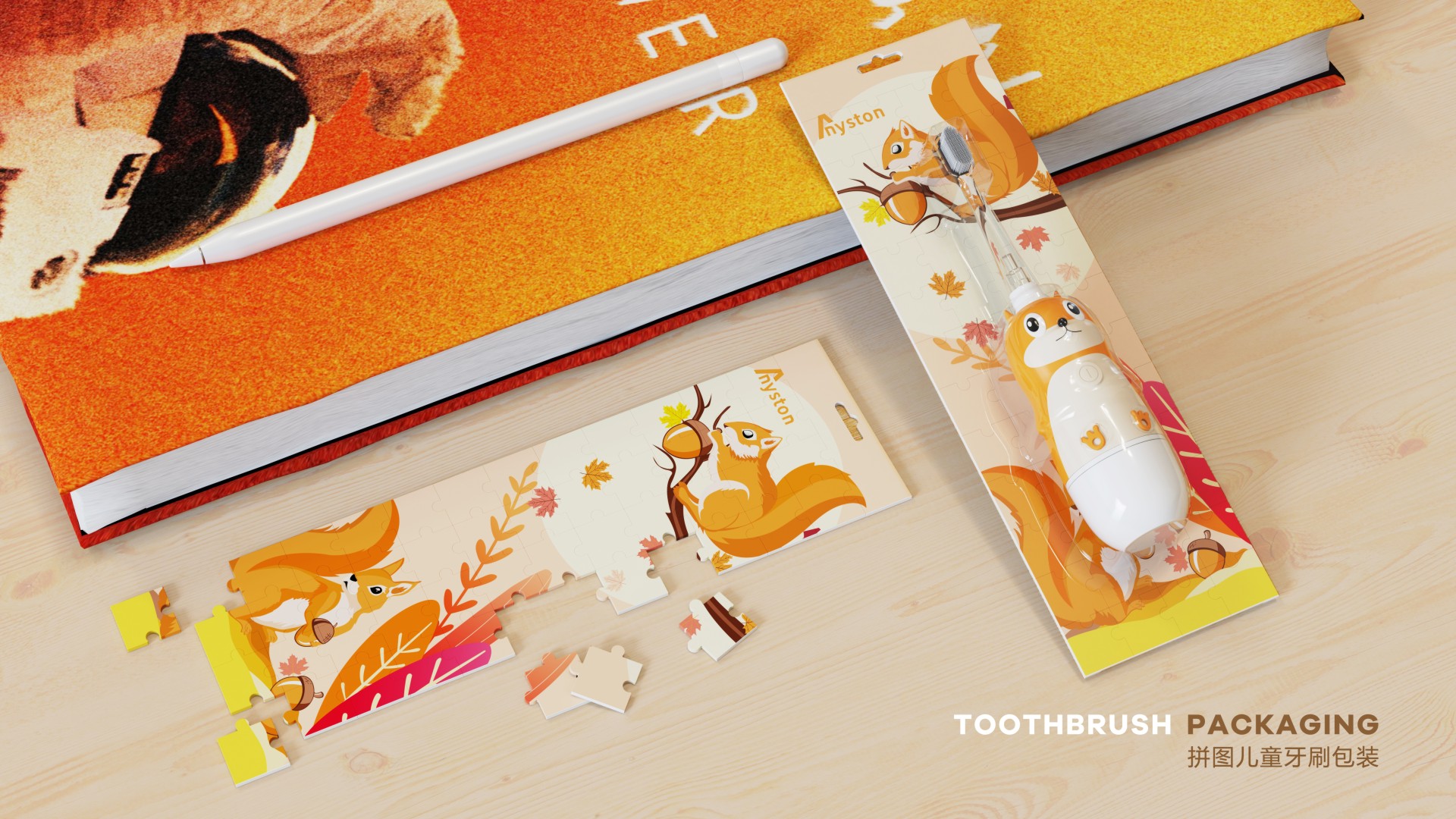 这款儿童牙刷包装采用长期利用的环保设计理念,牙刷包装的背板采用插画风格,背板的正面为动物主题的卡通图案,整体设计成拼图形式,用户在使用产品后,包装盒可以作为益智类产品给孩子当做拼图玩具使用,避免了浪费的问题,背板的背面为数字以及运算符号,在图拼不上时,数字可以当作拼接顺序给予提示,同时也可以学习使用功能。
