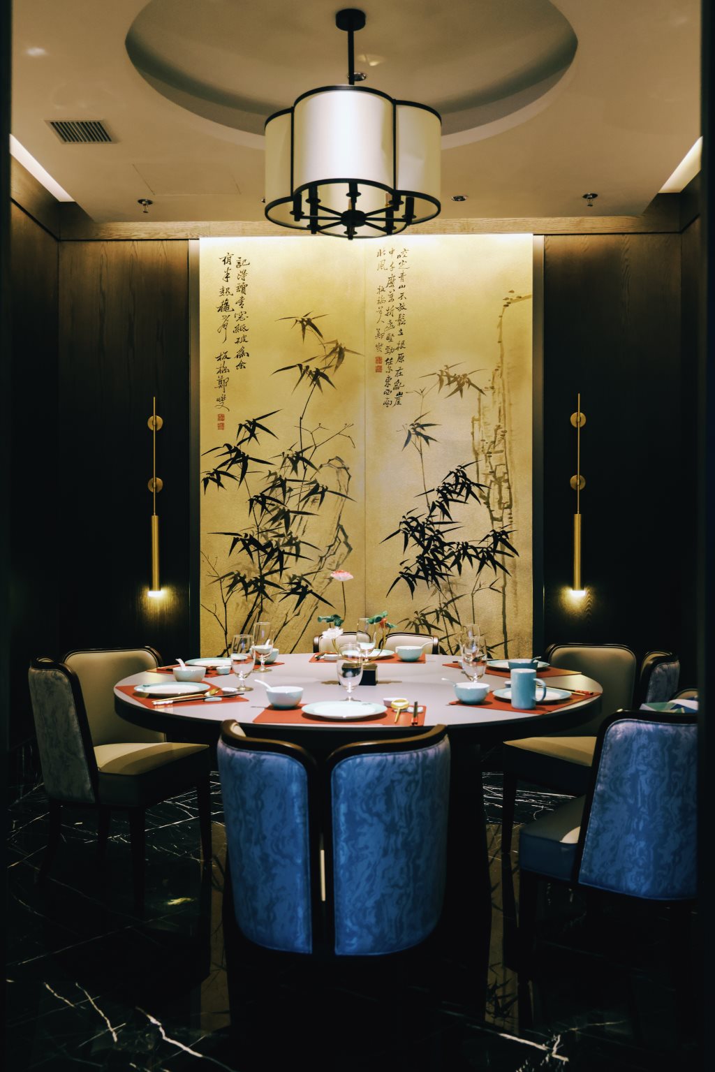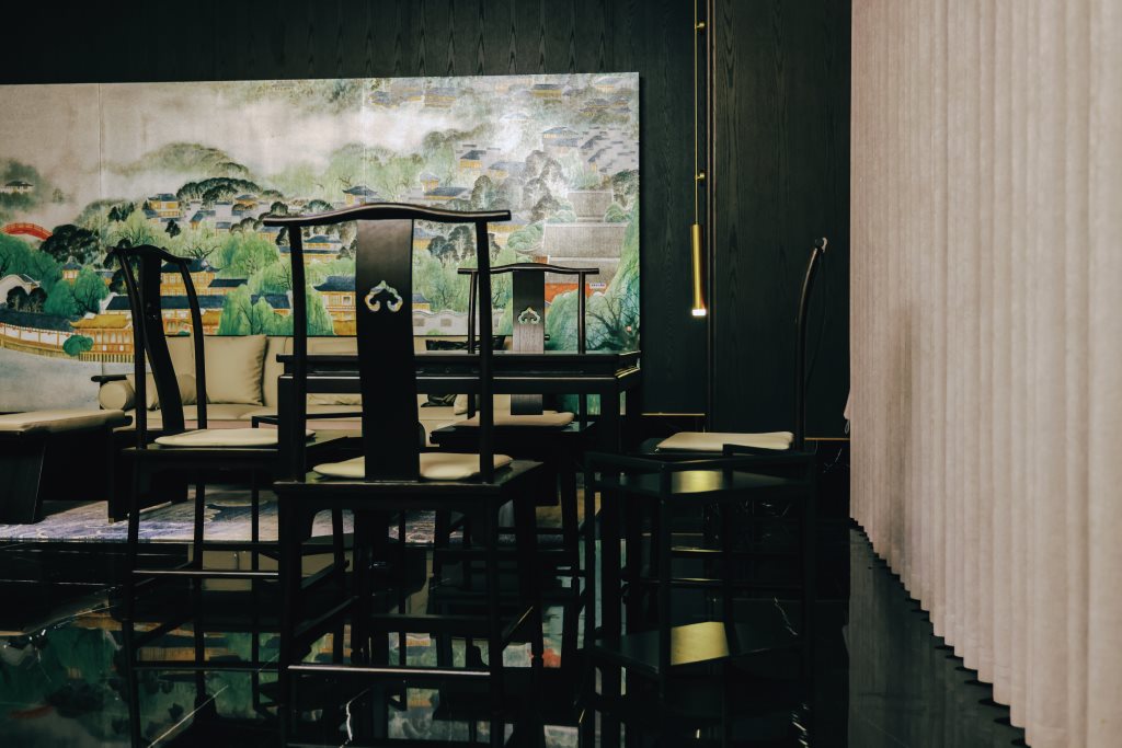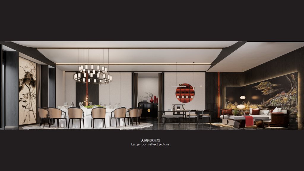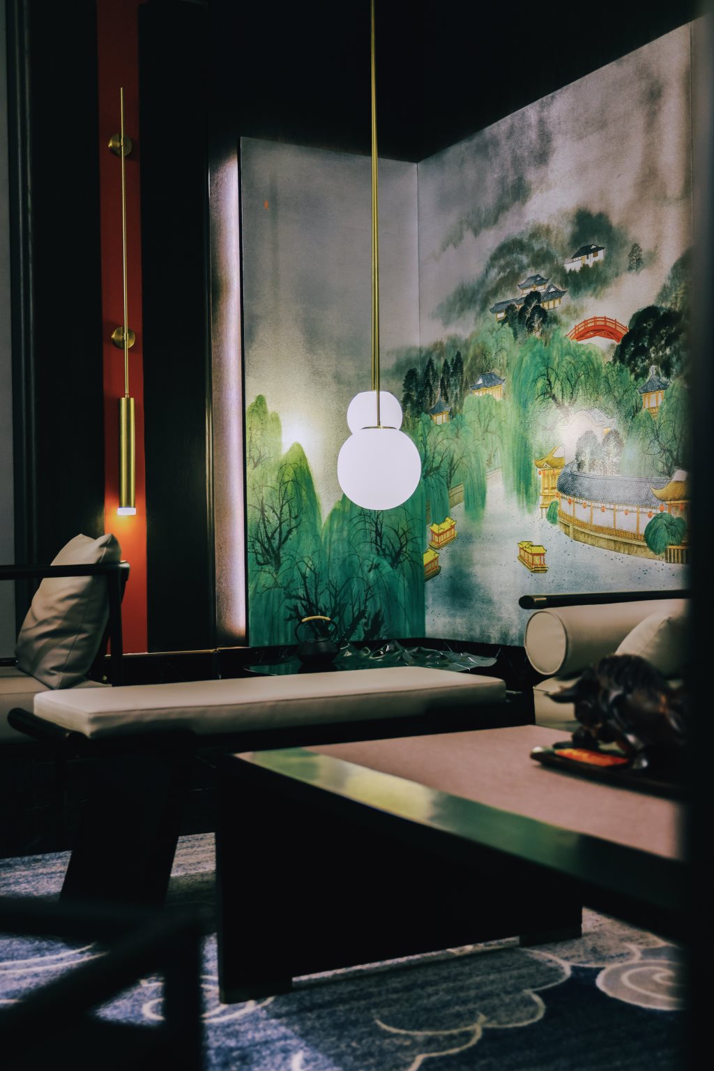 设计中,古色古香的墨绿、白、绿灰、浅棕、砖红等色彩,与黑色石材、木饰面、烤漆画等传统材料相得益彰,辅以现代的金属、艺术涂料,构筑出一个色彩丰富、质感细腻的空间。每一处细节,都透露出对传统与现代融合的深思熟虑。
