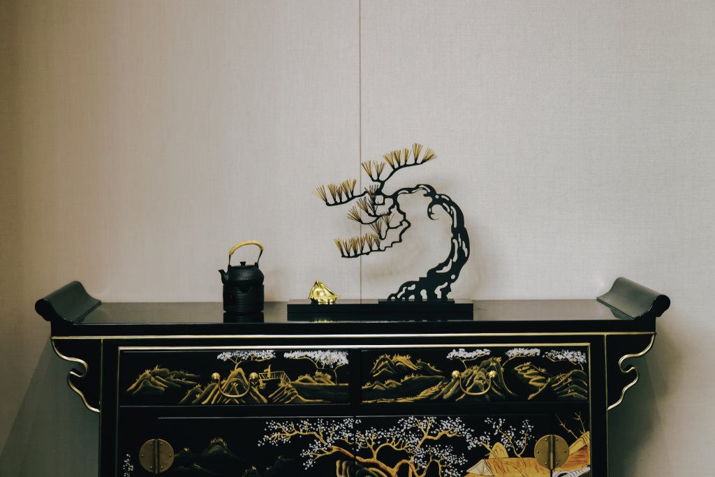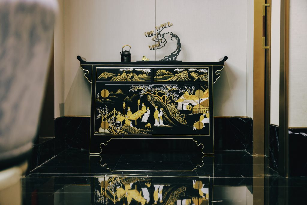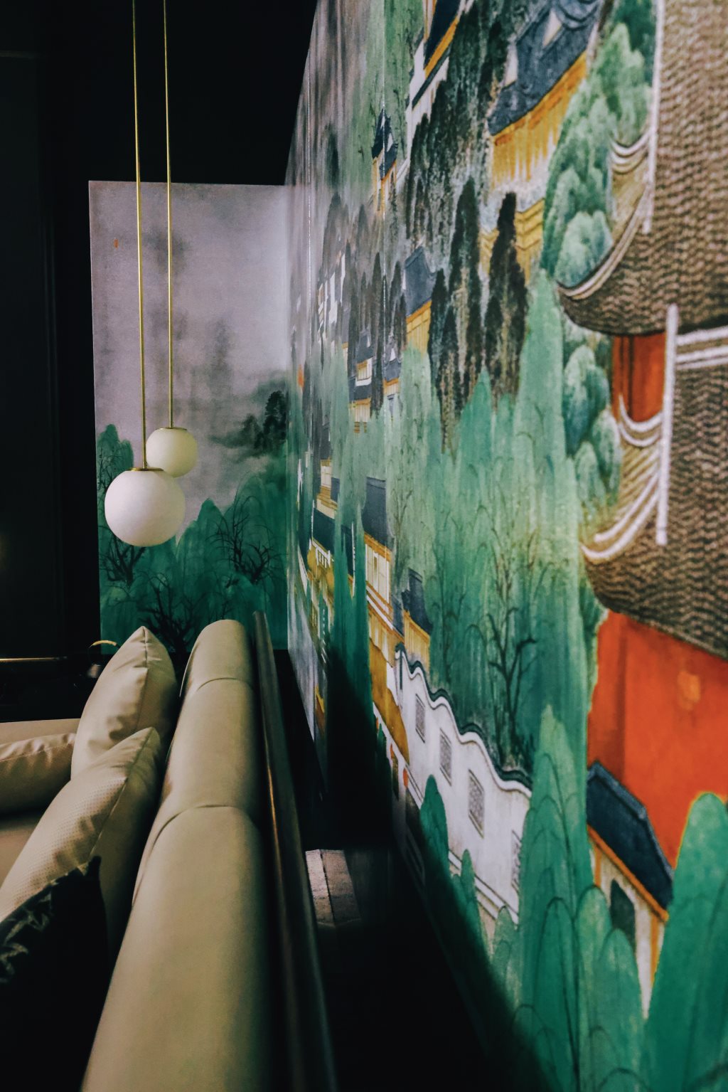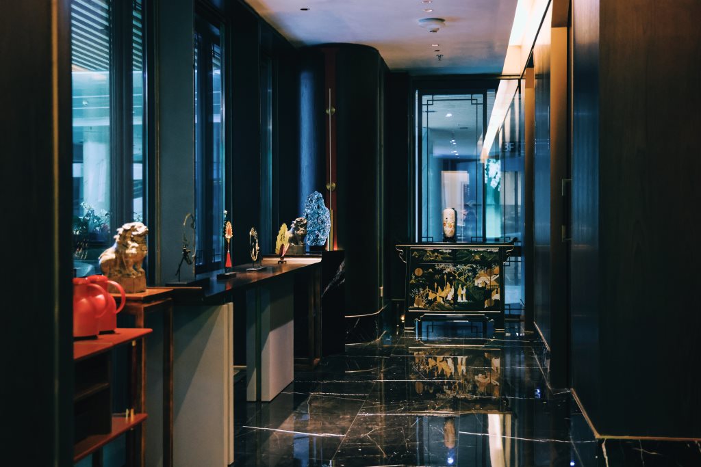 设计中,古色古香的墨绿、白、绿灰、浅棕、砖红等色彩,与黑色石材、木饰面、烤漆画等传统材料相得益彰,辅以现代的金属、艺术涂料,构筑出一个色彩丰富、质感细腻的空间。每一处细节,都透露出对传统与现代融合的深思熟虑。
